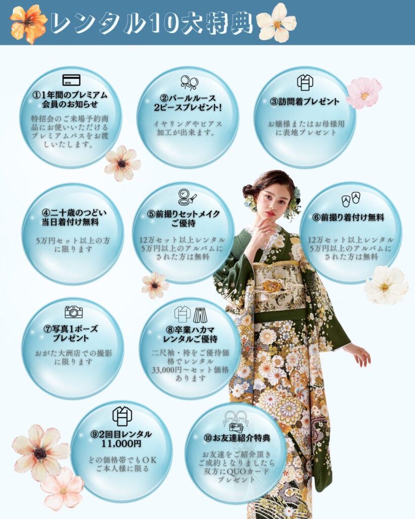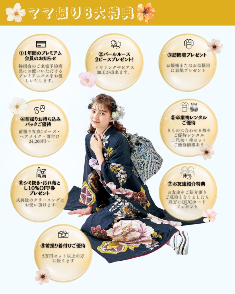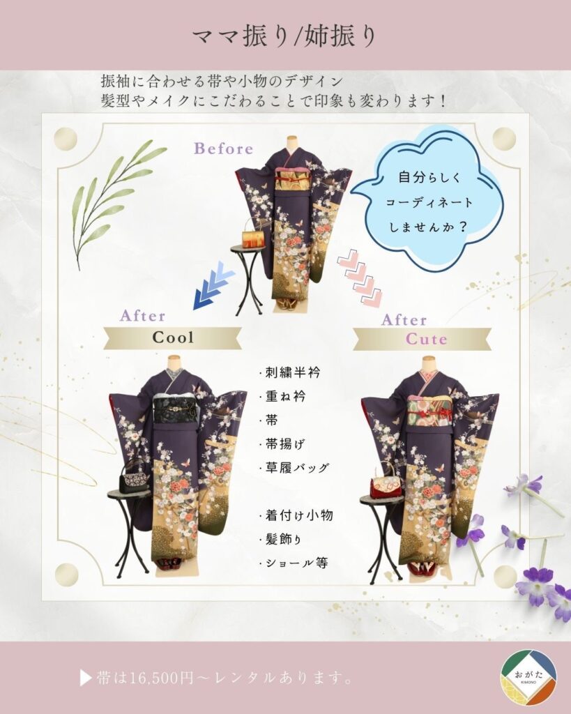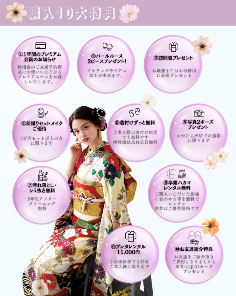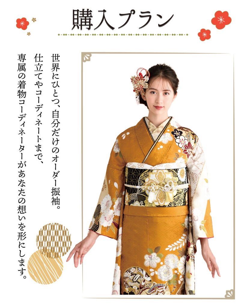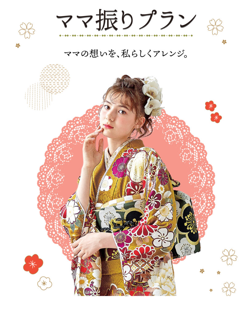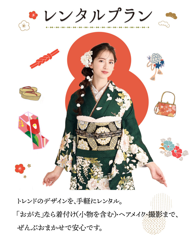 まずはお気軽に見学・ご試着へ。「おがた」では、何度でもご試着いただけます。気になる振袖を着て、お写真を撮りながら、心ゆくまでお選びください。ご購入・レンタル・ママ振りなど、あなたにぴったりのプランをご提案いたします。サイズはSから3Lまで幅広くご用意しておりますので、安心してご来店ください。